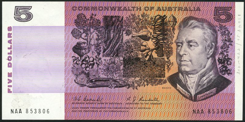 (x) Commonwealth of Australia, $5 (2), ND (1967), both prefix NAA, purple and multicoloured, Banks at right, plants at centre, Coombs-Randall signatures