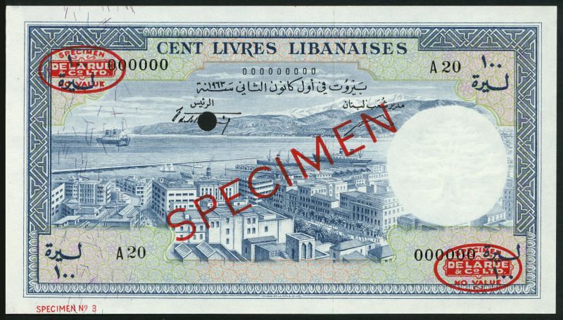 (†) Banque de Syrie et du Liban, specimen 10 Livres, 1963, prefix Z22, green, Baalbeck ruins, reverse shoreline; specimen 50 Livres, 1964, prefix D12, brown, coastal landscape, reverse sea stacks; 100 Livres, 1963, prefix A20, blue, Beirut harbour, reverse cedar, all overprinted SPECIMEN in red with two De La Rue ovals on obverse and reverse, one punch hole