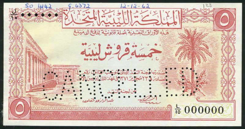 (†) United Kingdom of Libya, specimen 5 piastres (2), L.1951, prefixes L/10 and L/14, red on yellow underprint, colonnade at left, palm at right, value at low left and top right, reverse red