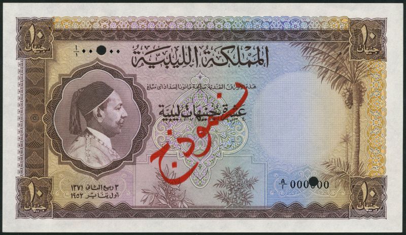 (x) Kingdom of Libya, a specimen set of the issue of 1952 comprising 5 piastres, red, 10 piastres, green, 1/4 pound, red-orange, 1/2 pound, violet, 1 pound, blue, 5 pounds, green and 10 pounds, brown, all 1 January 1952 and zero serial numbers, all King Idris at left wearing fez