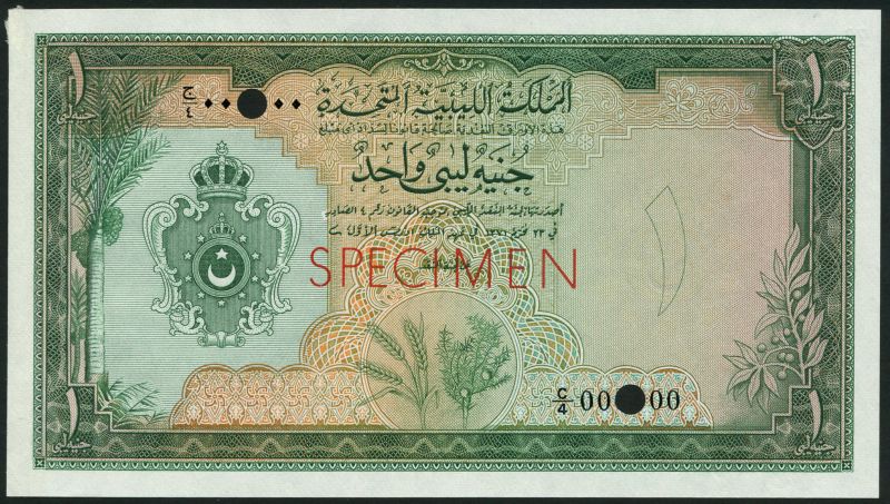 (†) United Kingdom of Libya, specimen colour trial ½ Pound, serial number D/4 000000, olive-brown and multicoloured; specimen colour trial 1 Pound, serial number C/4 000000, green and multicoloured, both Law of 1955 (1958/59), both arms at left, reverse value at centre, guilloche at right, overprinted SPECIMEN in red on obverse and reverse, two punch holes