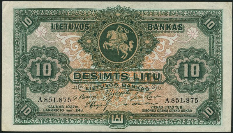 Bank of Lithuania, 1 ,5 and 10 centai, September 1919, 1,5,10 and 20 centu, November 1922, 10 centu (2), 20 centu (2), 1922, 10 litu (2), 1927, green, 5 litai (2), 1929, 20 litu, 1930, brown and green,