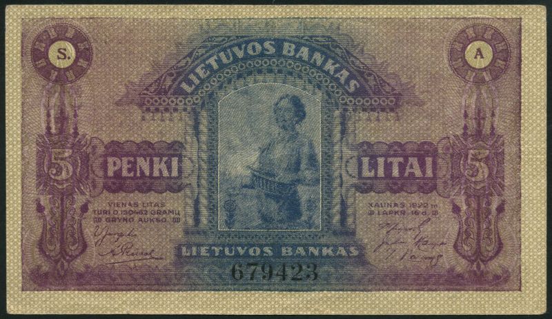 Bank of Lithuania, 5 litai, 1922, black serial number D372333, blue and violet, farmer sowing seed at centre, reverse green, mauve and red-brown, maiden spinning at right