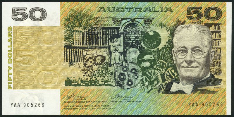 (x) Commonwealth of Australia, $50, ND (1973), serial number YAA, brown, black and multicoloured, Lord Howard Walker Florey at right, Phillips-Wheeler signatures
