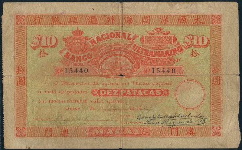 (x) Banco Nacional Ultramarino, Macao, 10 patacas, 31 May 1927, serial number 15440, red and pale green, arms and galleon at centre, value top left and right, two printed signatures low right, manuscript signature low left, reverse red and pale green, arms at centre, value at left and right