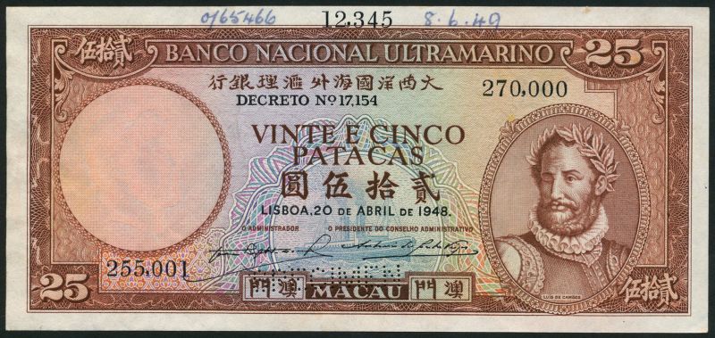 (†) Banco Nacional Ultramarino, Macao, printer's archival specimen 25 Patacas, 20 April 1948, serial run 255,001 to 270,000, two signatures, brown on pale blue underprint, Luis de Camoes at right, steamship and MACAU at lower centre, reverse woman looking at ships, perforated SPECIMEN
