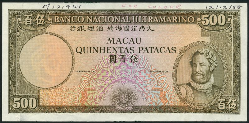 (†) Banco Nacional Ultramarino, Macao, specimen 500 patacas, ND (1958), no serial numbers, olive and multicoloured, De Camoes at right, arms low centre, value at centre and at each corner, reverse green and lilac, youth and ships, ship seal at left