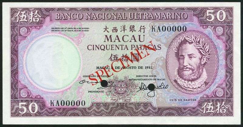 (†) Banco Nacional Ultramarino, Macao, specimen colour trial 10 Patacas, ND (ca 1963-68), zero serial numbers, green on multicoloured underprint, Bishop Cameiro at right, reverse woman looking at ships; specimen 50 Patacas (2), 8 August 1981, serial numbers KA00000, KQ00000, different signature combinations, both purple on multicoloured underprint, Luis de Camoes at right, reverse 19th century harbour scene, the first two overprinted SPECIMEN in red on obverse and reverse, the third overprinted SPECIMEN in red with two De La Rue ovals on obverse and reverse, two punch holes