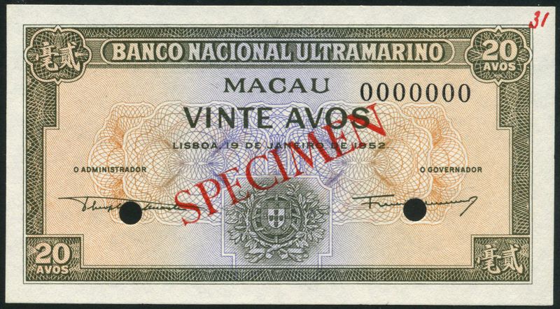 (x) Banco Nacional Ultramarino, Macau, a specimen set of fractional issues of the 19 January 1952 series comprising 2 avos, violet, 5 avos, brown, 10 avos, green and 20 avos, olive and pale orange, all arms low centre
