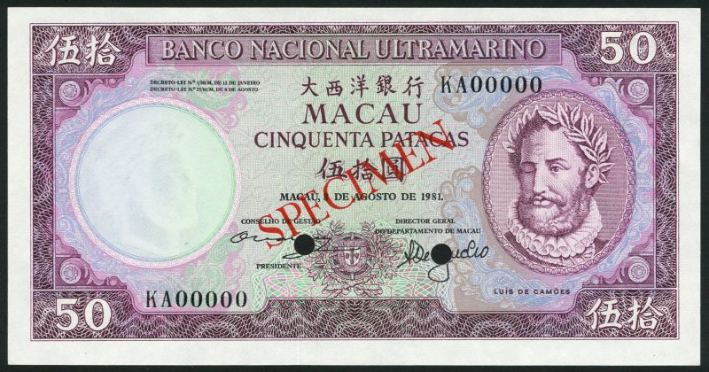 (†) Banco Nacional Ultramarino, Macao, specimen 10 Patacas, 8 August 1981, serial number CA00000, brown on multicoloured underprint, lighthouse at right; specimen 50 Patacas, 8 August 1981, serial number KA000000, purple on multicoloured underprint, Luis de Camoes at right, both reverse 19th century harbour scene, both overprinted SPECIMEN in red on obverse and reverse, two punch holes