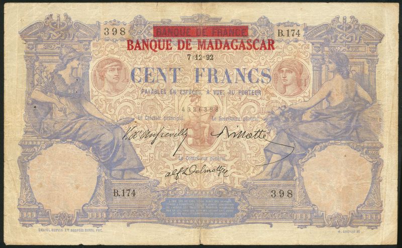 Banque de Madagascar, 100 Francs, ND (1926 - old date 7 December 1892), serial number B174 398, violet, blue and brown, woman seated at left and right, reverse woman with cornucopia, seated woman and man representing agriculture and industry, overprinted BANQUE DE MADAGASCAR in red