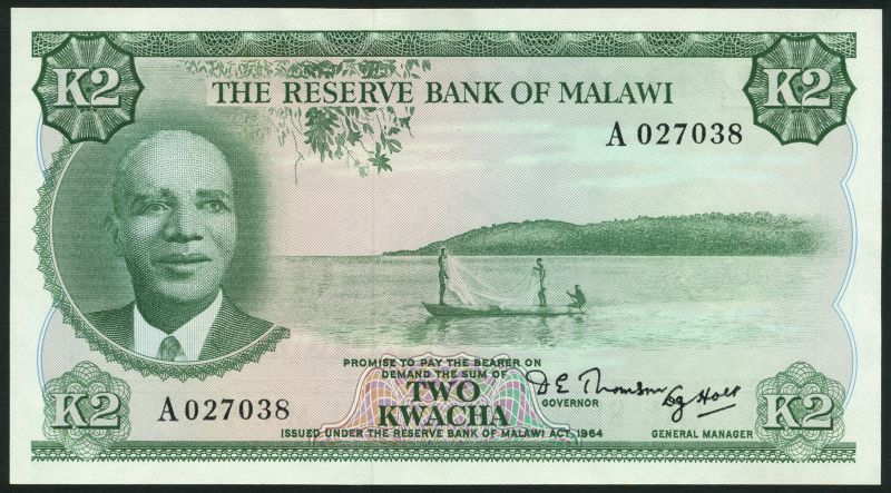 Reserve Bank of Malawi, 1 kwacha, ND (1971), serial number A471585, red-brown, and 2 kwacha, ND (1971), serial number A027038, green, both with Hastings Banda at left, fishing boat at centre, value at each corner