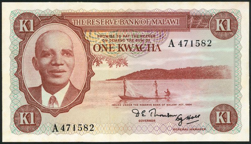 Reserve Bank of Malawi, 1 kwacha (2), ND (1971), serial numbers A471582-83, red-brown on multicolour underprint, Dr Hastings Banda at left, fishing boat at right, value at each corner