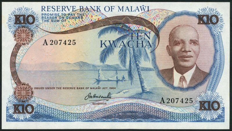 Reserve Bank of Malawi, 10 kwacha, ND (1973), serial number A207425, blue and brown on multicolour underprint, Dr Hastings Banda at right, fisherman and palm at centre, value at each corner