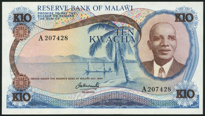 Reserve Bank of Malawi, 1 and 2 kwacha (2), ND (1971), and 1 and 10 kwacha, ND (1973), Dr Hastings Banda and fishing boat, value at each corner
