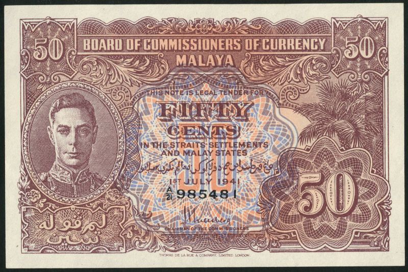 Board of Commissioners of Currency, Malaya, a selection of the fractional notes comprising 1,5,10,20 and 50 cents, 1 July 1941, all George VI at right, also 25 cents, 1 September 1940