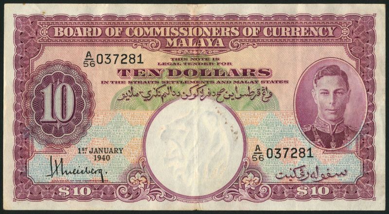 Board of Commissioners of Currency, Malaya, $10, 1 January 1940, serial number A/56 037281, purple and multicoloured, George VI at right, value at left, reverse purple and white, arms, value low left and right