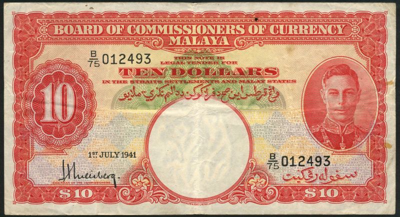 Board of Commissioners of Currency, Malaya, 1 cent, 5,10,20 and 50 cents, all 1941, all George VI at left, also 10 cents, 1940, $10, 1 July 1941, prefix B/75, red and multicoloured,