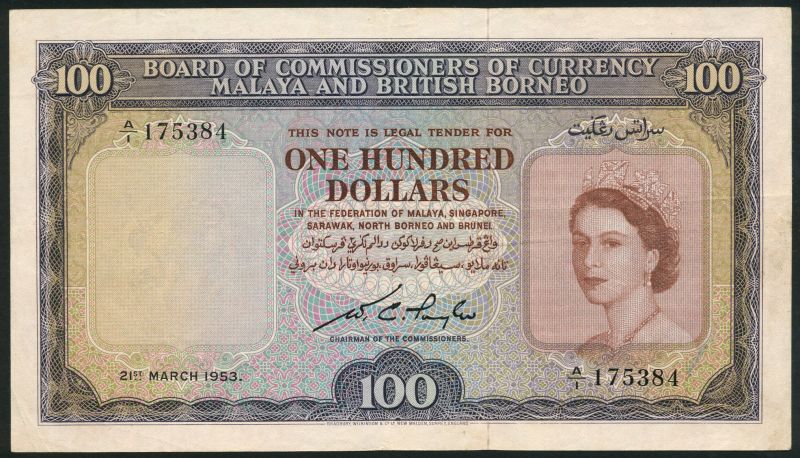 Board of Commissioners of Currency, Malaya and British Borneo, $100, 21 March 1953, serial number A/1 175384, purple and multicoloured, Elizabeth II at right, Taylor signature, reverse purple and white, arms, value at left