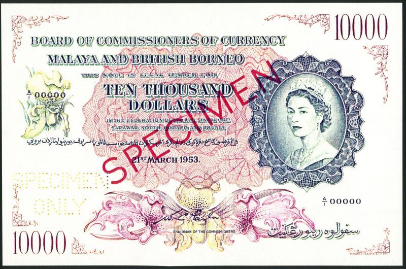 (†) Board of Commissioners of Currency, Malaya and British Borneo, an obverse and reverse official copy of a colour trial $10000, 21 March 1953, serial number A/1 00000, purple, pink and multicoloured, Elizabeth II at right, orchids in field, Taylor signature, reverse grey-green and white, arms