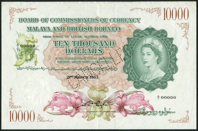(†) Board of Commissioners of Currency, Malaya and British Borneo, specimen 10000 dollars, 21 March 1953, serial number A/1 00000, green and pink with a pale brown central guilloche, Elizabeth II at right, orchids low centre and at left, value left centre and top left and low right, reverse green, sixteen arms at centre, value at left and right, Jawi text below