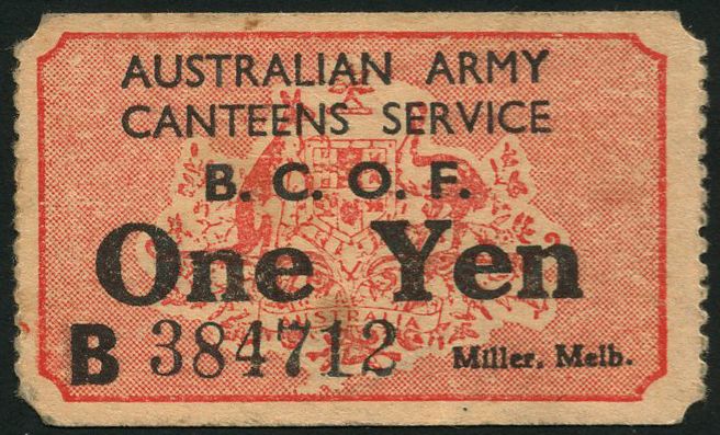 Australian Army Canteens service, B.C.O.F., a 1 yen, ND (ca 1941), serial number B 384712, pink red on card, ONE YEN in black at centre, Australian arms in underprint at centre, perforated edges