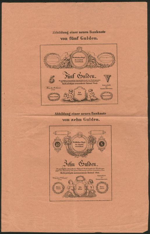 Privilegirte Oesterreichische National-Bank, 5 Gulden and 10 Gulden Formulare, 1 January 1841, black on salmon pink with both values on same sheet, both without profile of Austria at upper centre and shield between cherubs at lower centre