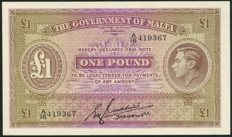 Government of Malta, £1 (5), ND (1940), serial numbers A/16 419365-69, brown and violet, George VI at right, value at centre, left and each corner