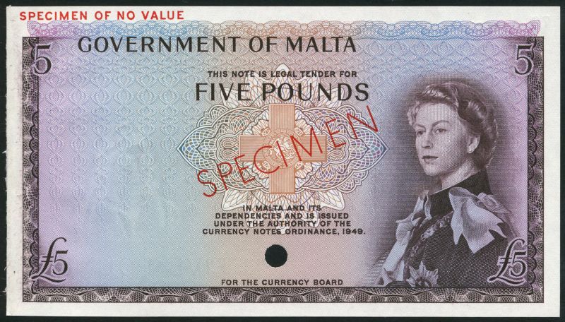 Government issue, Malta, colour trial £5, ND (1963), purple-brown and multicoloured, Elizabeth II at right, George Cross at centre