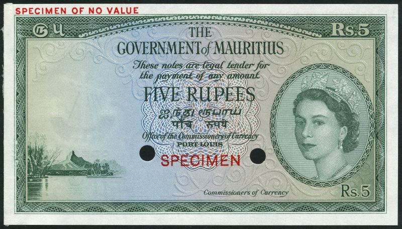 Government of Mauritius, colour trial 5 rupees, ND (1954), no serial numbers, green and multicoloured, Elizabeth II at right, mountain at left, reverse green, arms at centre