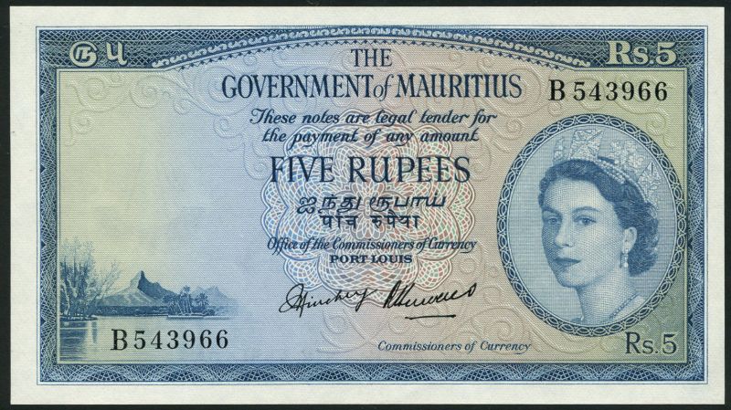 (x) Government of Mauritius, 5 rupees, ND (1954), serial number B 543966, blue and multicoloured, Elizabeth II at right, mountain low left, reverse blue, arms at centre