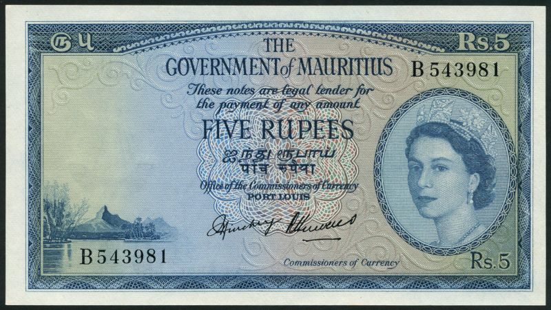(x) Government of Mauritius, 5 rupees, ND (1954), serial number B 543981, blue and multicoloured, Elizabeth II at right, mountain at left, reverse blue, arms at centre