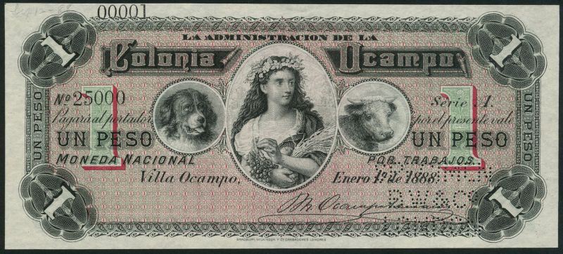 (†) La Administracion de la Colonia Ocampo, Mexico, specimen 1 peso, Villa Ocampo, 1 January 1888, A 00001-25000 black and pale green and pink, maiden (Abundance) at centre, dog at left, bull at right, reverse, pale pink-red and green, value at centre