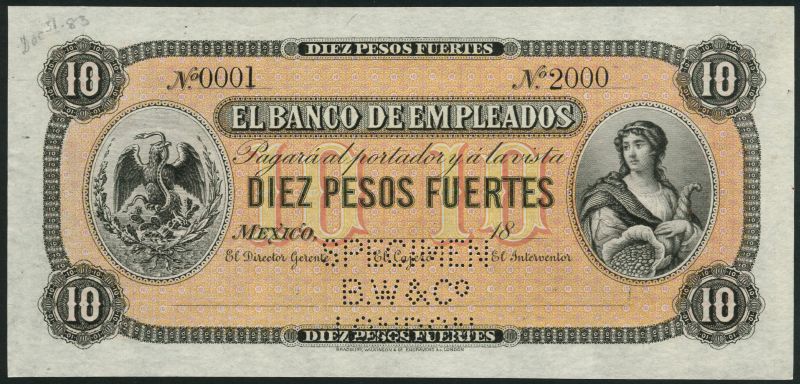 (†) El Banco de Empleados, Distrito Federal-Mexico City, specimen 5 pesos fuertes, Mexico, 18-, serial number 0001-10000, black and pale green, maiden (Abundance) with cornucopia at left, arms at right, reverse blue and green, value, also a specimen 10 pesos fuertes, serial number 0001-2000, black and orange and yellow, arms at left, maiden with cornucopia at right, reverse pale red and orange, value