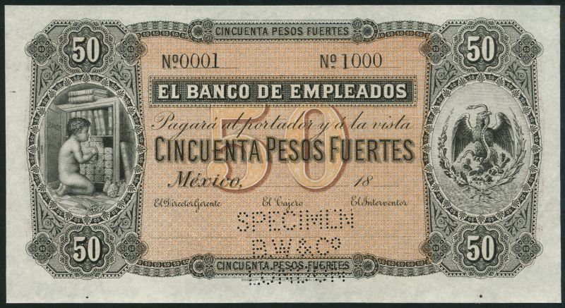(†) El Banco de Empleados, Distrito Federal-Mexico City, specimen 50 pesos fuertes, Mexico, 18-, serial number 0001-1000, black and pale orange-brown, cherub at safe at left, arms at right, reverse orange and brown, value in field