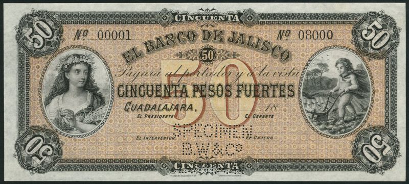 (†) El Banco de Jalisco, Mexico, specimen 50 pesos Fuertes, Guadalajara, 18- (ca 1898), serial number 00001-08000, black, pink and green, maiden (Ceres) at left, cherub and plough at right, value in field, reverse brown and orange, medallic female head at left and right