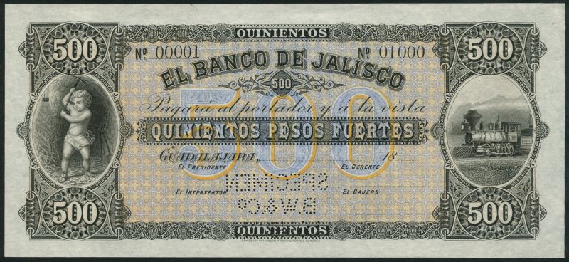 (†) El Banco de Jalisco, Mexico, specimen 500 pesos Fuertes, Guadalajara, 18- (ca 1898), serial number 00001-01000, black, pale orange and blue, cherub with pickaxe at left, locomotive at right, value in field, reverse orange and blue, medallic female head at left and right