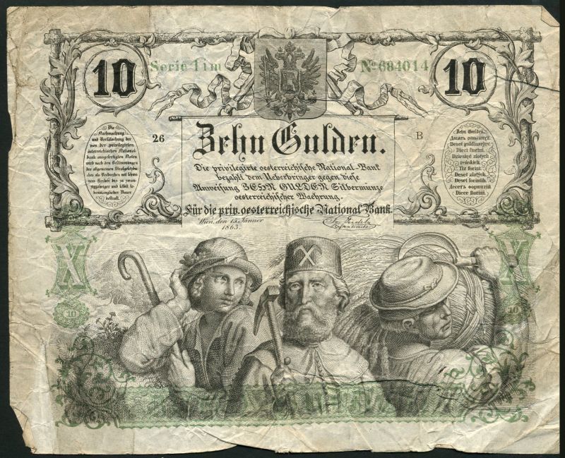 Privilegirte Oesterreiche National-Bank, 10 gulden, 1863, serial number 684014, black and green, shepherd, miner and peasant at low centre, also K.K. Staats-Central-Casse, 1 and 5 gulden, 1866, black and green and black and red respectively