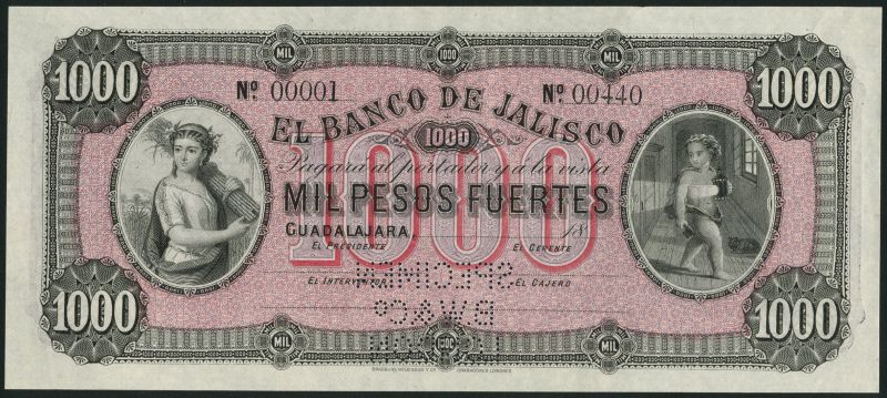 (†) El Banco de Jalisco, Mexico, specimen 1000 pesos Fuertes, Guadalajara, 18- (ca 1898), serial number 00001-00440, black, pink and mauve, maiden with bundle of twigs at left, cherub with lantern at right, value in field, reverse red and lilac, medallic female head at left and right