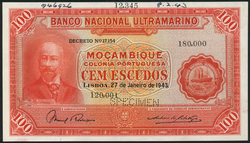 (†) Banco Nacional Ultramarino, Mozambique, specimen 100 escudos (2), 27 January 1943, serial numbers 060001-120000 and 120001-180000, red-orange and multicoloured, Antonio Ennes at left, ship seal at right, reverse red-orange, maiden and ships at centre