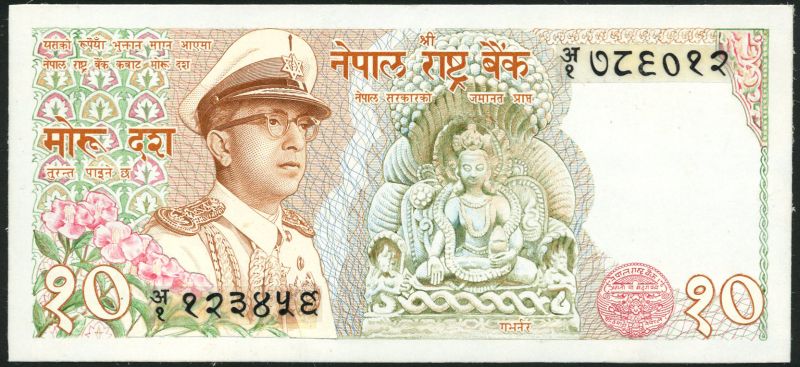 (†) Central Bank of Nepal, an obverse and reverse composite essay for a 1 rupee, ND (1972), violet and multicoloured, King Mahendra Vira Vikrama at left, the Great Stupa at Bodhnath at centre, reverse violet and green, Singa Dunbar at Kathmandu at centre, also an obverse 10 rupees, ND (ca 1972), multicoloured, King Mahendra Vira Vikrama at left,