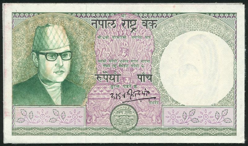 (†) Central Bank of Nepal, a partially hand excecuted design for the obverse of a note of unspecified denomination, ND, (c.1970), green and purple, hand painted portrait of King Mahendra Vira Vikrama at left