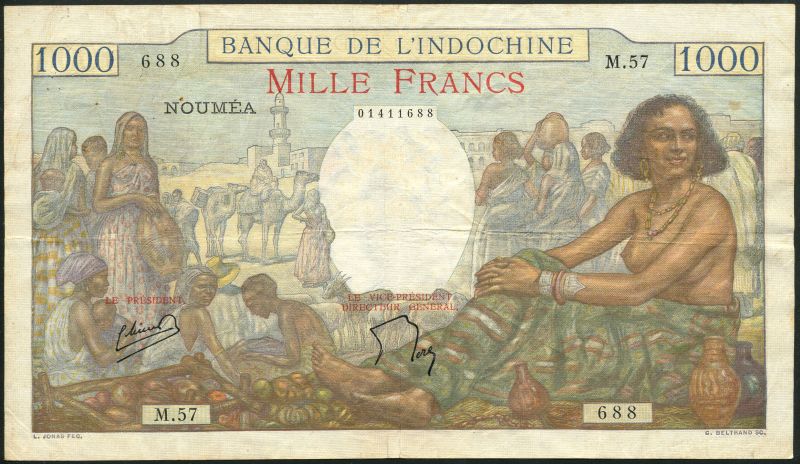Banque de l'Indo-Chine, New Caledonia, 100 francs, ND (1963), green and brown, France at centre, also 1000 francs, ND (1957), multicoloured, market scene, Minost and Flers signatures