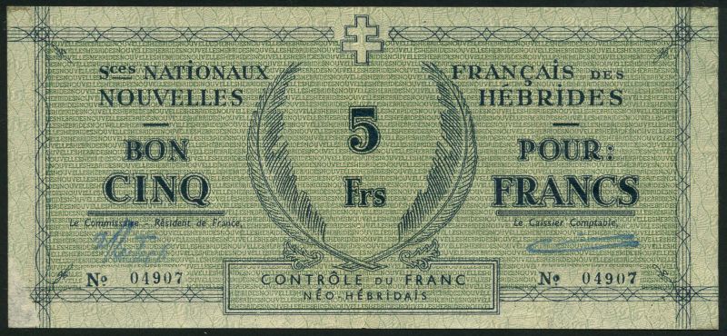 Services Nationaux Francais des Nouvelles Hebrides, 5 francs, ND (1943), serial number 04907, dark blue on green, wreath and Cross of Lorraine at centre, handstamped signature low left and right, reverse green, value in blue at left and right