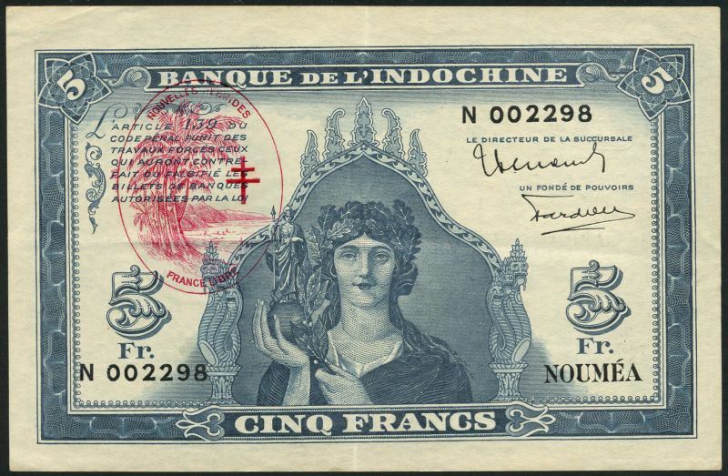 Banque de l'Indo-Chine, New Hebrides, 5 francs ND (1945), serial number N 002298, blue and white, Athena at centre, red oval NOUVELLES HEBRIDES FRANCE LIBRE and Cross of Lorraine top left, also 20 francs, purple and pale green, France at right, red oval at centre