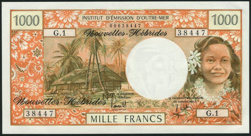 Institut d'Emission d'Outre-Mer, New Hebrides, 100 francs, multicoloured, girl at left, signature 1, 500 francs, blue-green, signature 1, fisherman at right and 1000 francs, red, signature 2, girl at right, all ND (1970-1975), also Tahiti issue 100 francs, girl with guitar at right, also 500 and 1000 francs, all signature 1, ND (1970-1971)