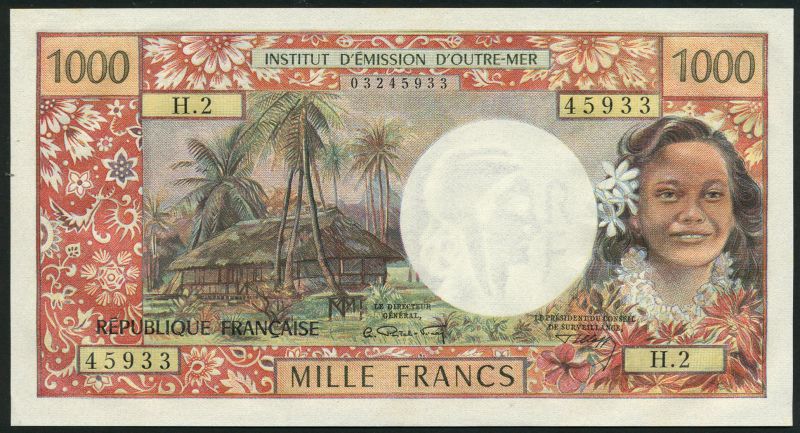 Institut d'Emission d'Outre-Mer, New Caledonia, 100 francs (2), multicoloured, girl with guitar at right, signature 1, 500 francs, blue-green, signature 1, fisherman at right and 1000 francs, red, signature 1, girl at right, all ND (1969), all REPUBLIQUE FRANCAISE in field