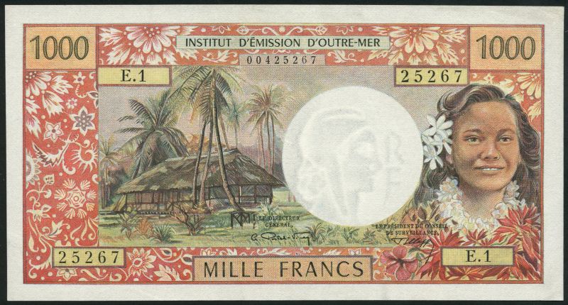 Institut d'Emission d'Outre-Mer, New Caledonia, 1000 francs, ND (1969), serial number E.1-25267, red and multicoloured, signature 1, girl at right, hut at left, Postel-Vinay and Clappier signatures, reverse red, deer and Kagu bird, NOUMEA in blue top centre