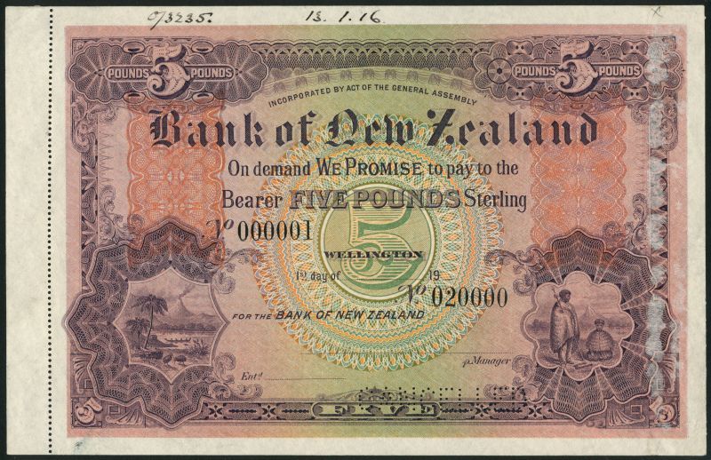 (†) Bank of New Zealand, specimen £5, Wellington, 19- (ca 1916), serial number 000001-020000, purple and multicoloured, value in green at centre, landscape low left, Maoris low right, reverse blue, green, lilac and orange, arms top centre, value at each corner