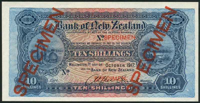 (†) Bank of New Zealand, specimen 10 shillings, Wellington, 1 October 1917, no serial numbers, blue and red, Maoris at left, landscape at right, reverse brown and grey, arms at centre, value at left and right